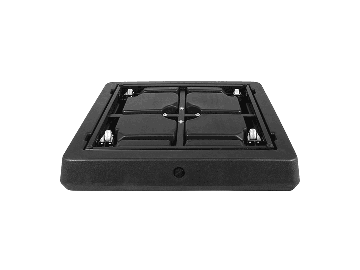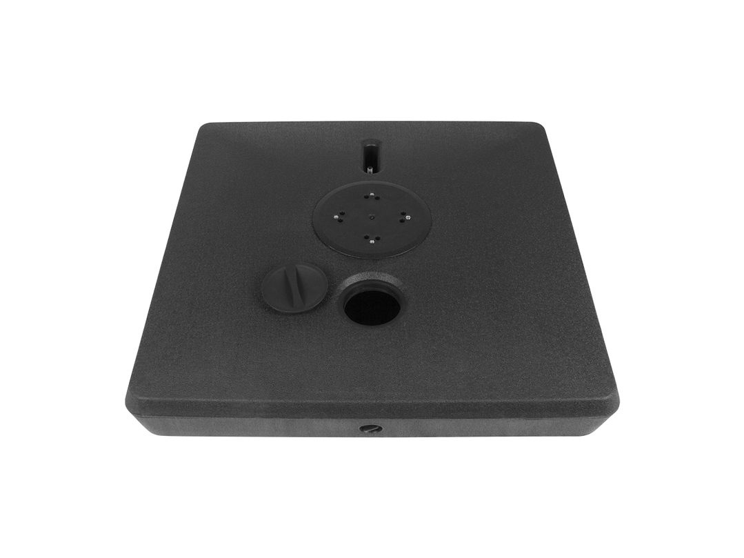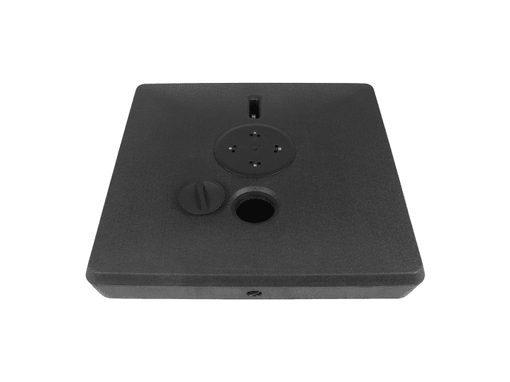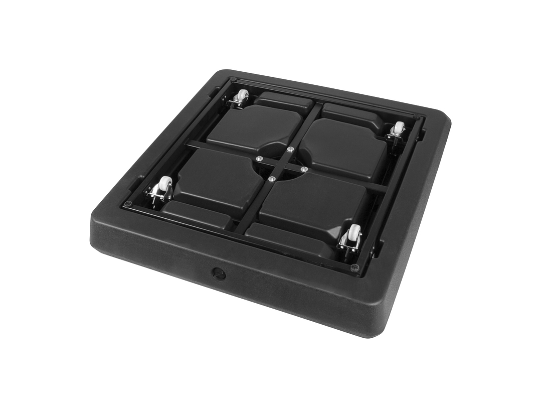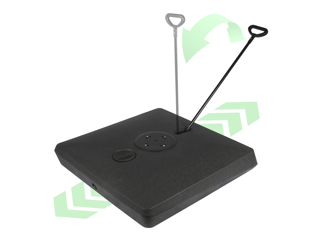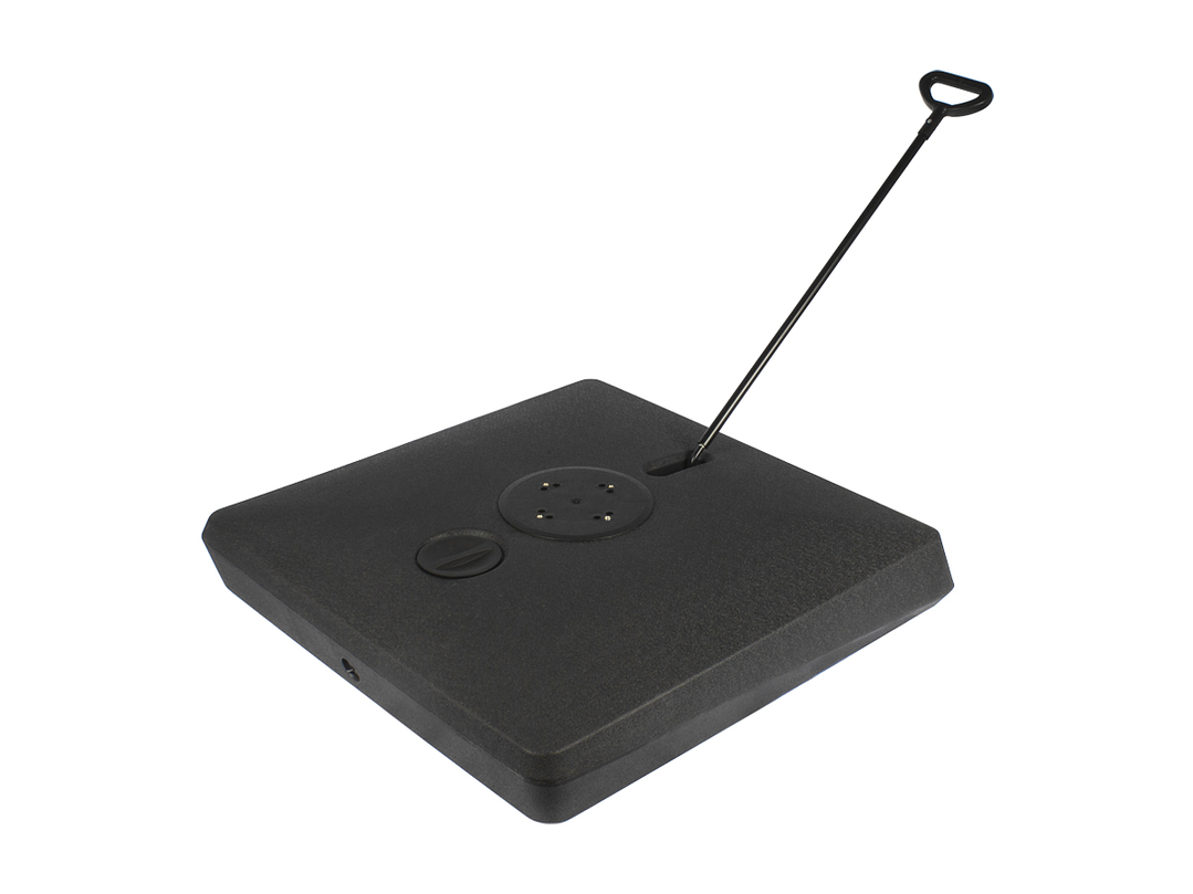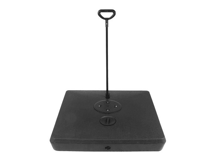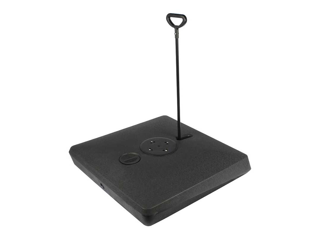 Base cuadrada de plástico rígido, rellenable (con agua, arena o piedrecilla, para darle mayor peso), con una capacidad total de 140kg o 140L. Viene con 4 ruedas sobre estructura de Acero y manilla tiradora retráctil, para fácil traslado y movimiento del quitasol.