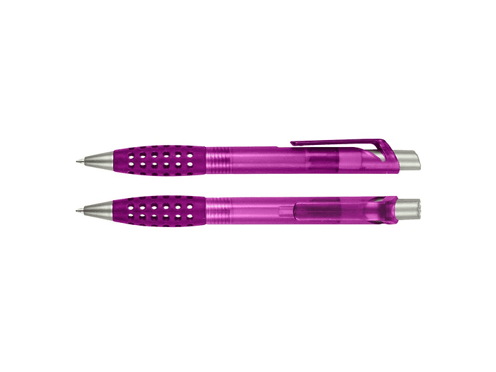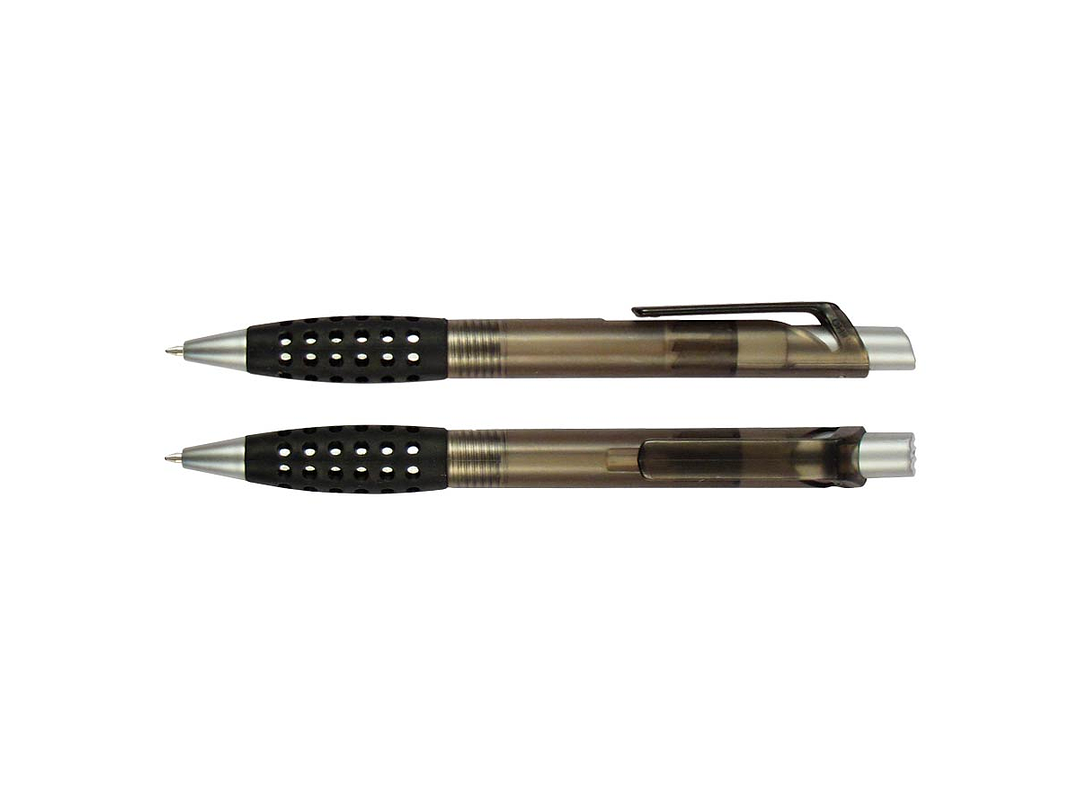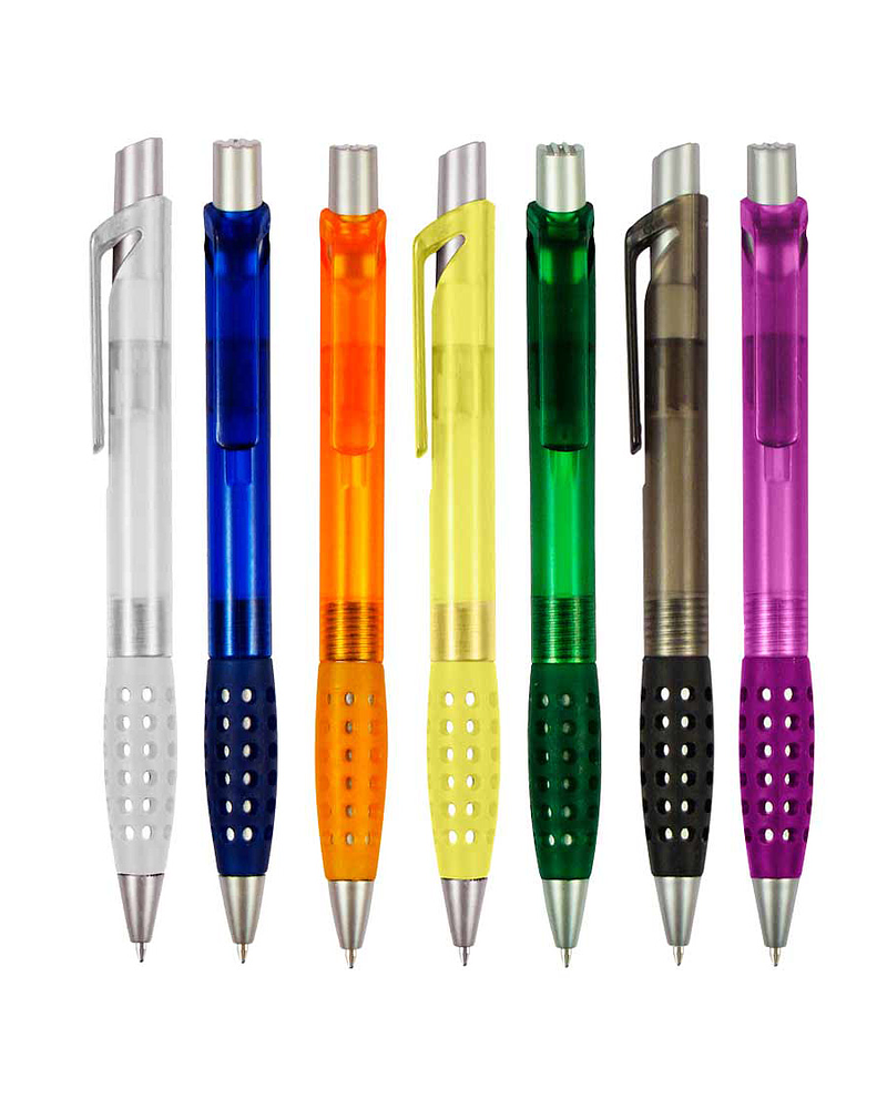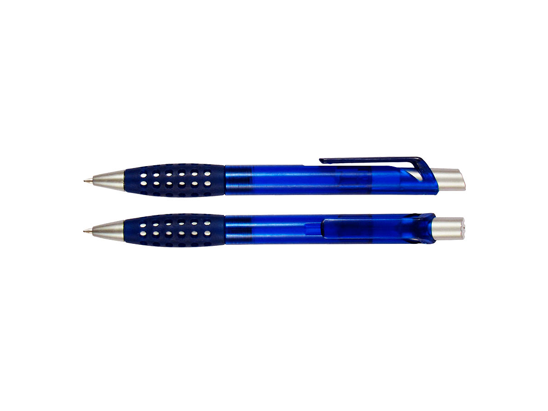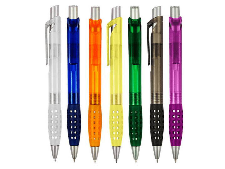 Bolígrafo plástico modelo "Punch" con grip de goma con orificios. Escritura azul.