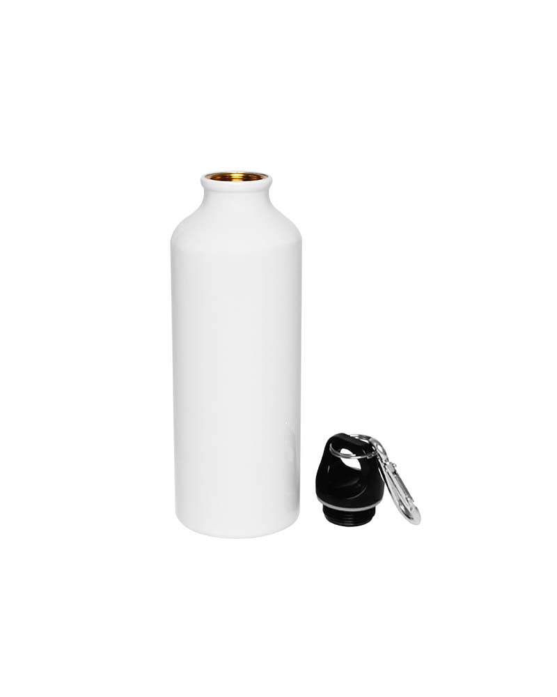 Botella blanca de Aluminio de 500cc. con cobertura para Sublimación. Incluye tapa rosca plástica y mosquetón metálico plateado.