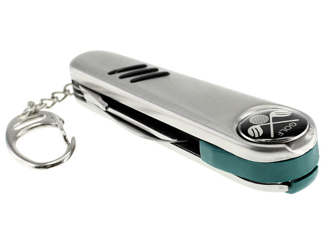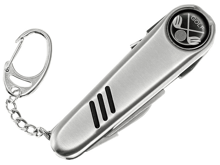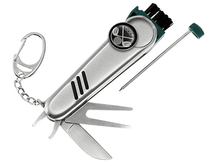 Cortaplumas de Golf de Acero Inoxidable con 7 funciones. Incluye Cuchillo, Levanta-Pique corto, Levanta-Pique largo, Cepillo, Bolígrafo tinta negra, Marcador magnético y llavero. Presentación en caja de regalo plateada.