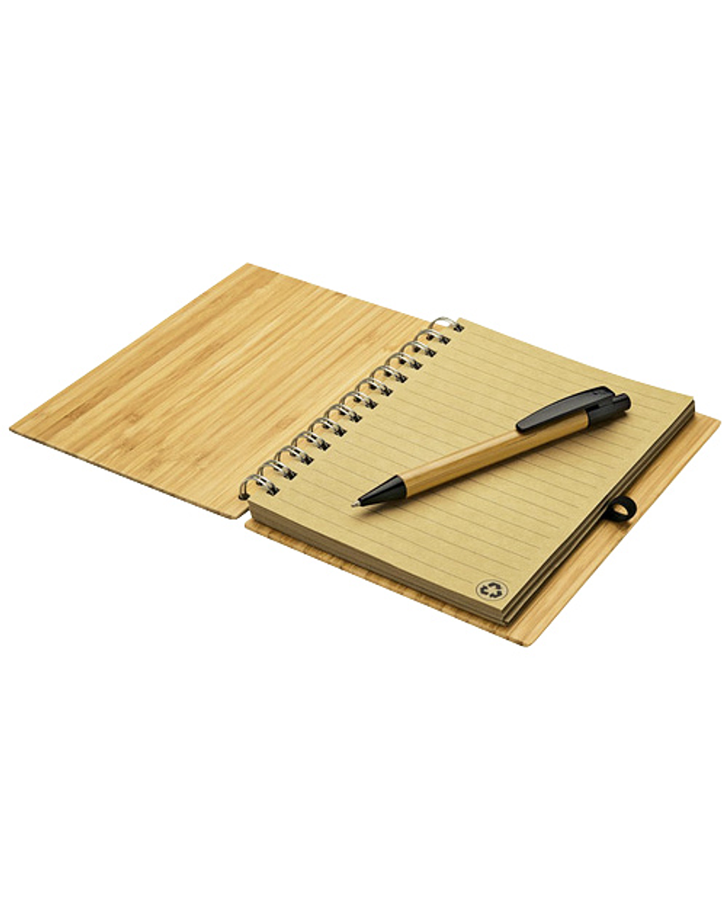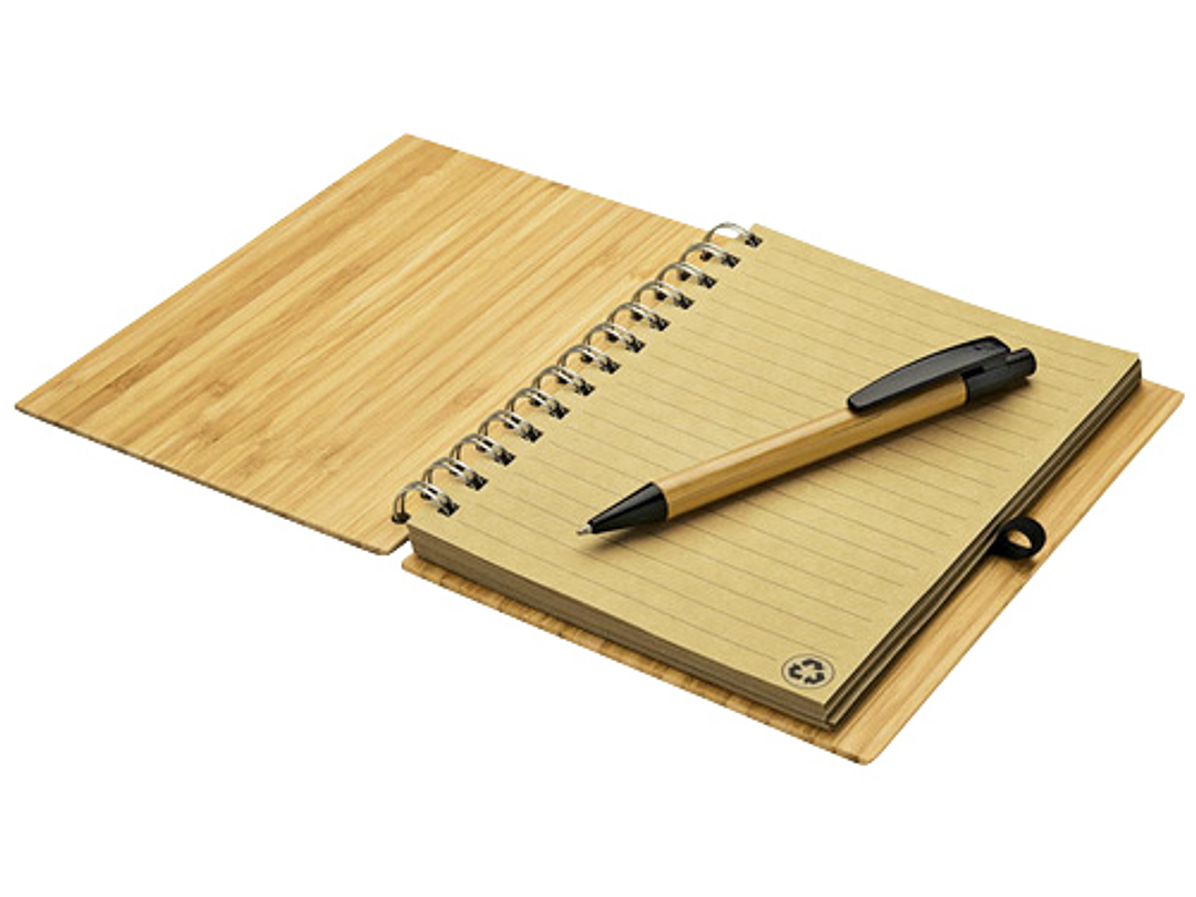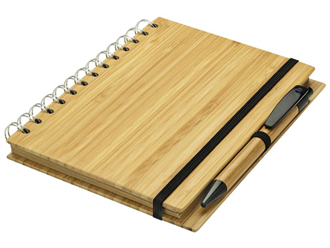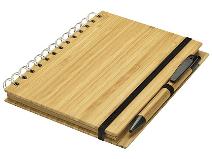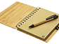 Cuaderno Ecológico con Tapas Duras de madera de Bamboo, 70 hojas interiores lineadas de papel Kraft y anillado metálico doble cero. Incluye Bolígrafo Ecológico de madera de Bamboo con detalles negros.