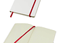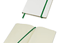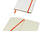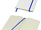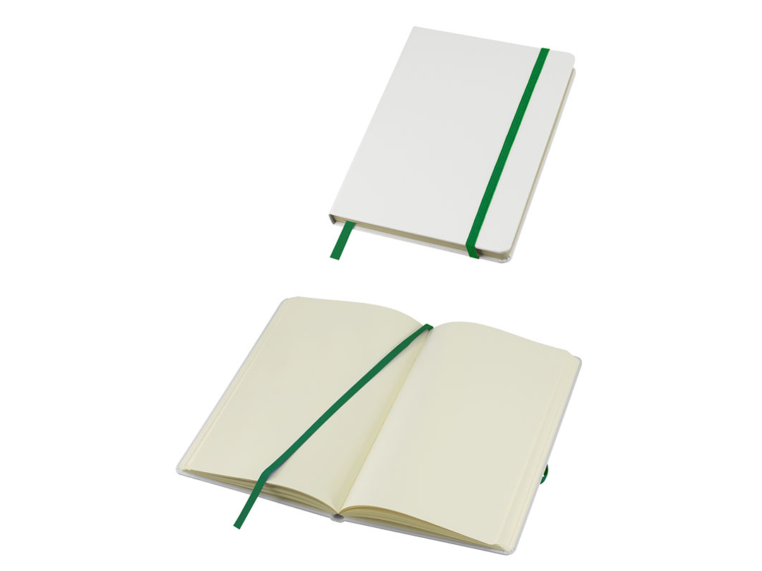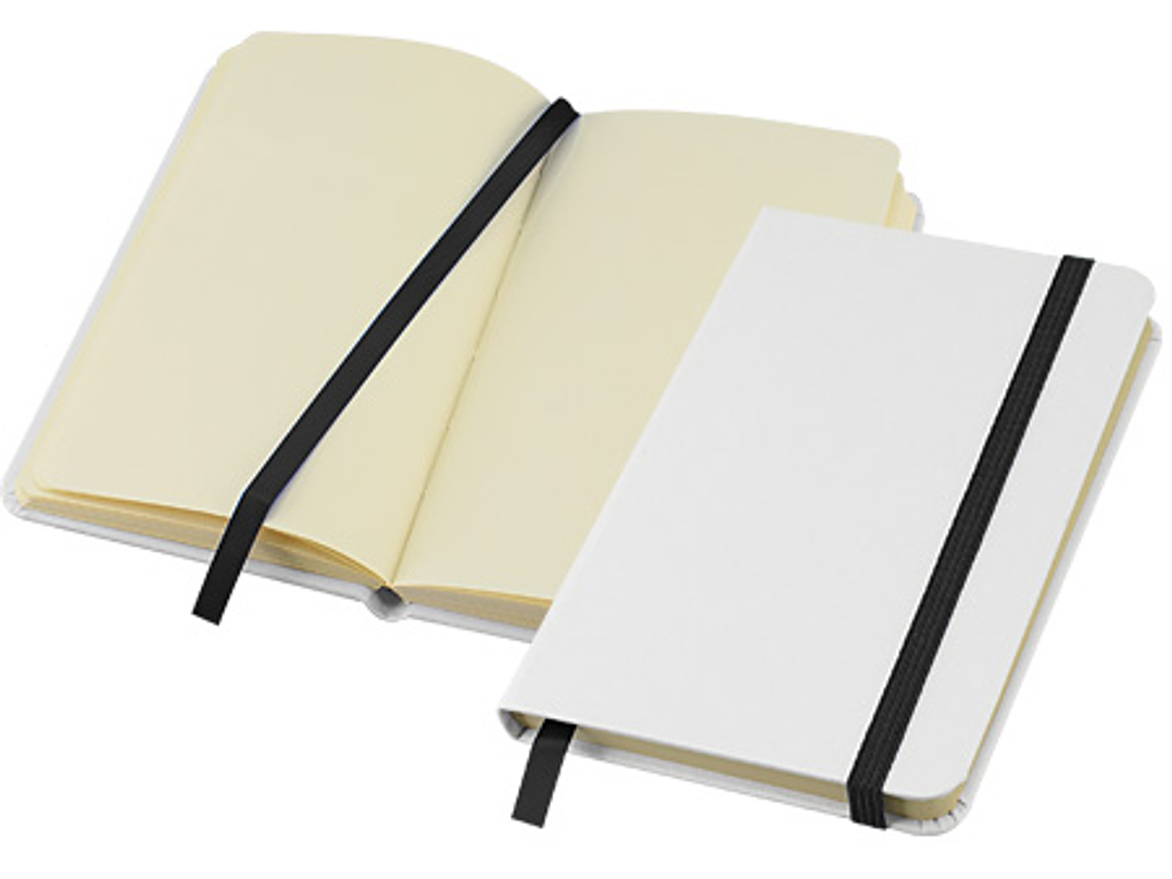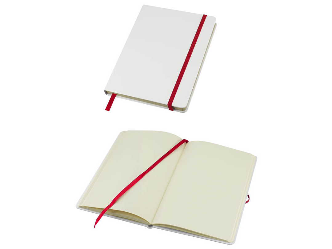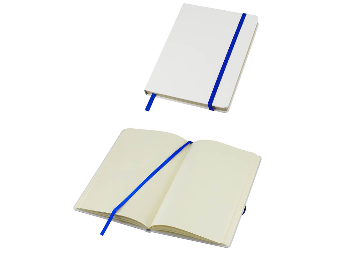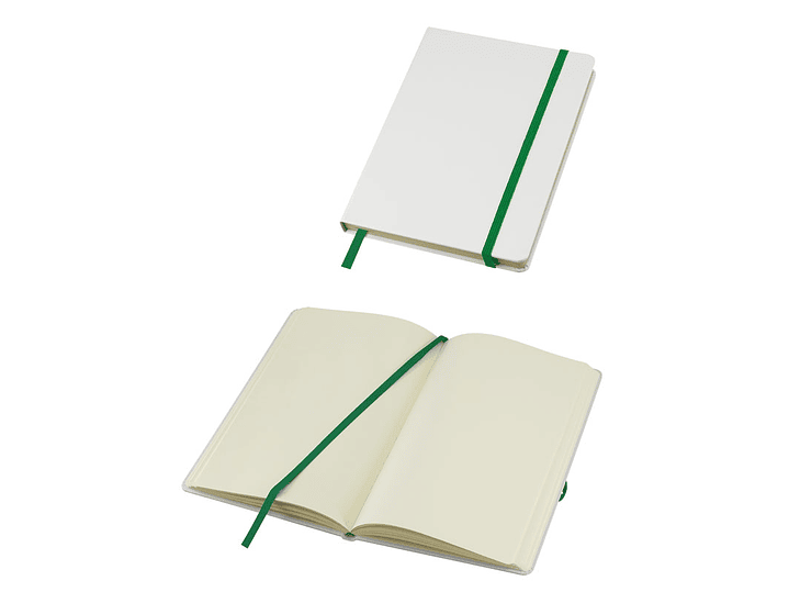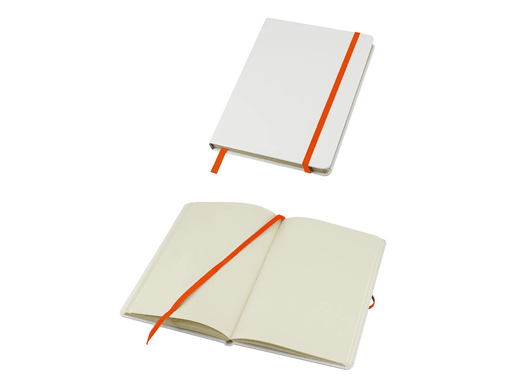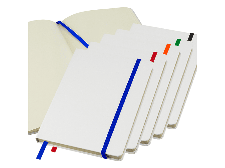 Cuaderno modelo "Whiteskine" tamaño A5, con cubierta de cartón piedra forrada en PU símil cuero blanco de 1.5mm de espesor. Interior 80 hojas limpias amarillas de 80gsm. Incluye banda elástica y huincha separador de hojas de color. Presentación individual en bolsa de polipropileno.