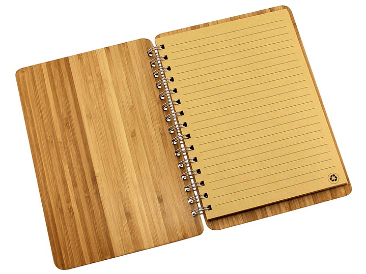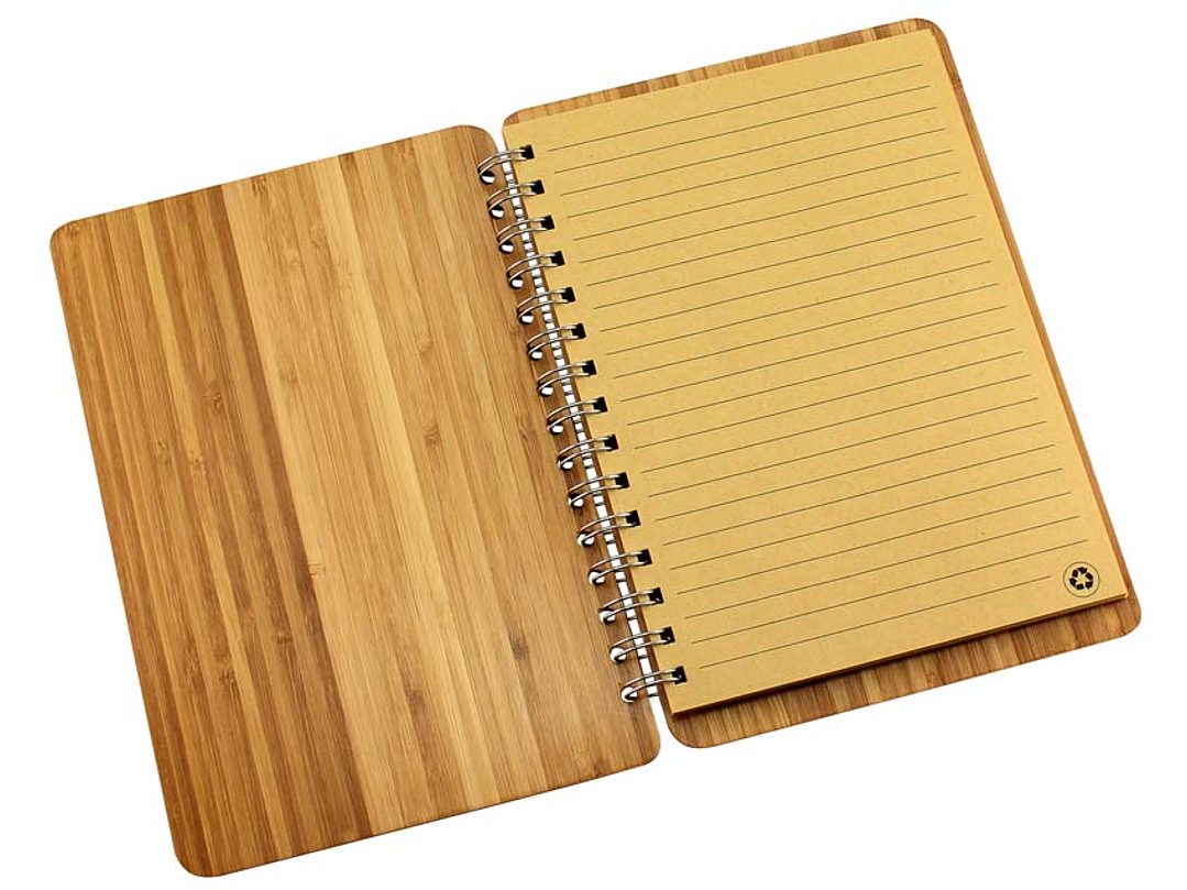 Cuaderno Ecológico con Tapas duras punta redondeada 100% de madera de Bambú de 3mm de espesor, interior 70 hojas lineadas interiores de papel Kraft reciclado de 14.3 x 20 cm y anillado metalico doble cero.