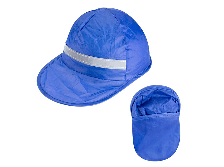 Gorro promocional plegable de poliéster, con banda reflectante en el frente. Se guarda plegado en bolsita ovalada de poliéster.