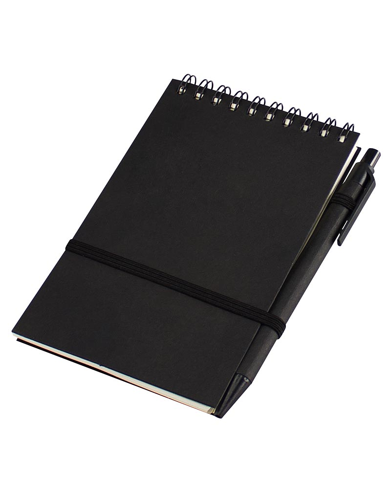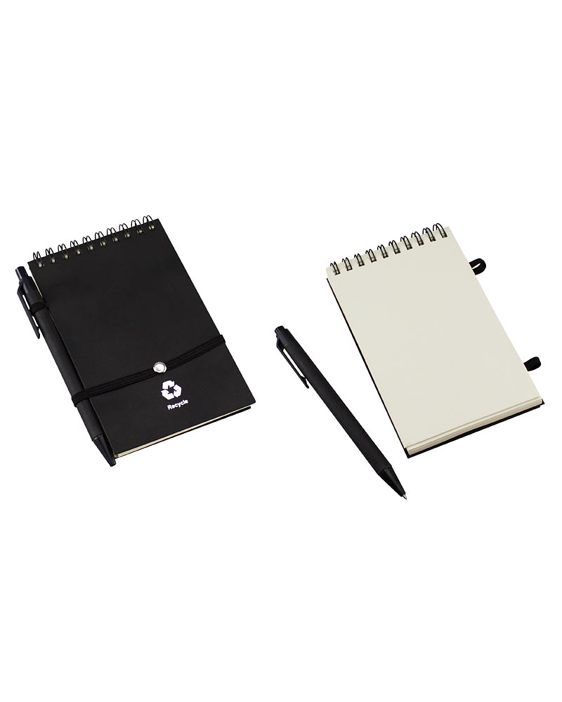 Libreta Ecológica con tapas de cartón reciclado, 70 hojas interiores blancas (croqueras). Incluye cierre elasticado y bolígrafo ecológico.