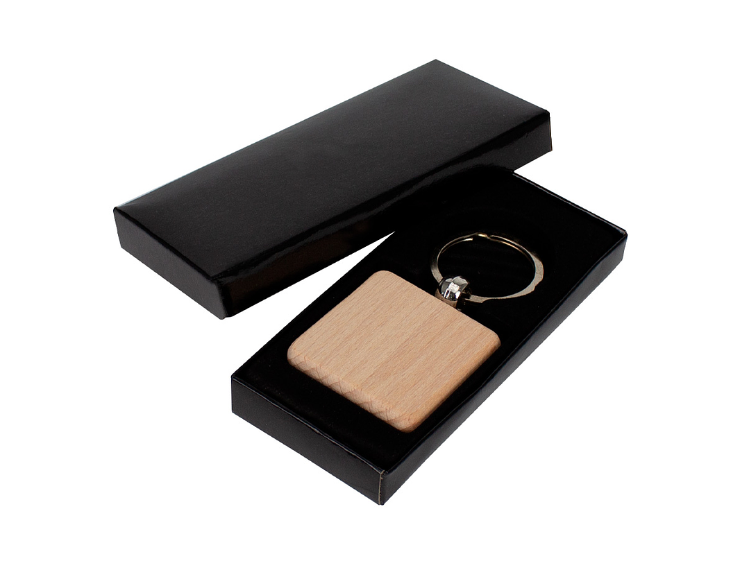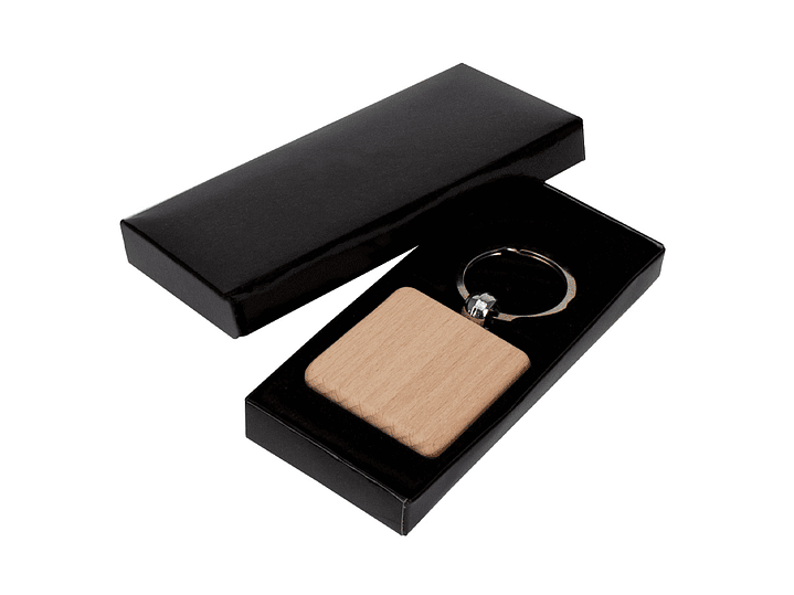 Llavero Cuadrado de Madera de Bamboo. Presentación en estuche laminado negro, con cuna aterciopelada.