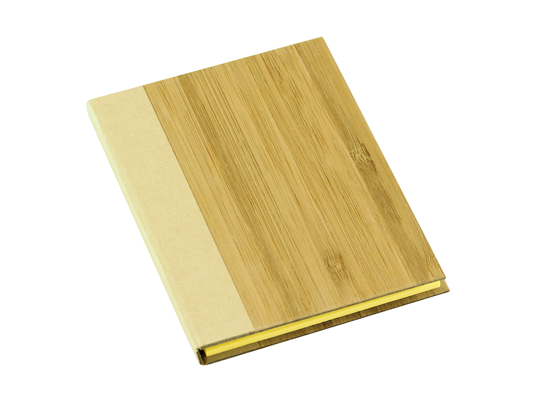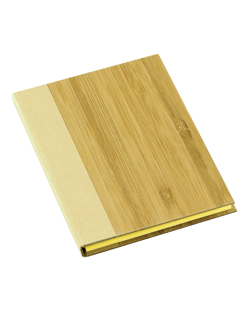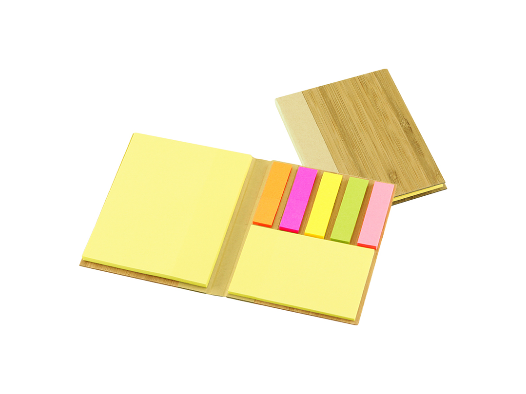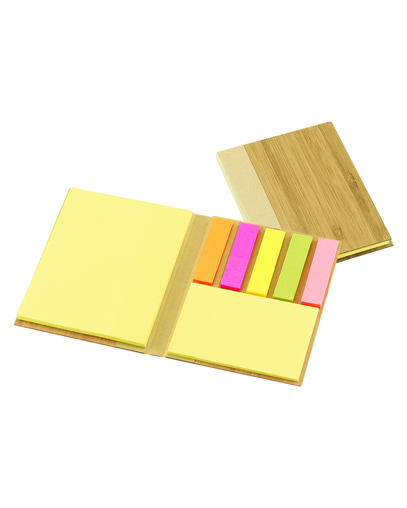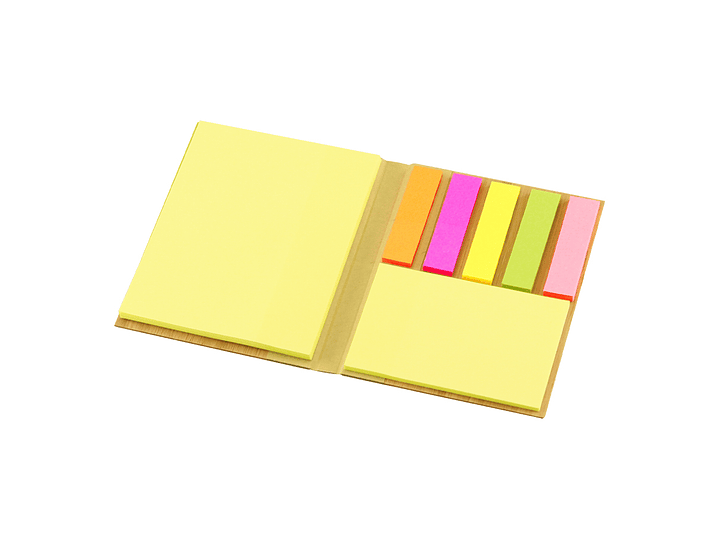 Memo Set con Tapas Duras enchapadas en madera de Bambú. Incluye 50 notas adhesivas amarillas grandes, 25 notas adhesivas amarillas medianas y 125 banderitas adhesivas de colores.