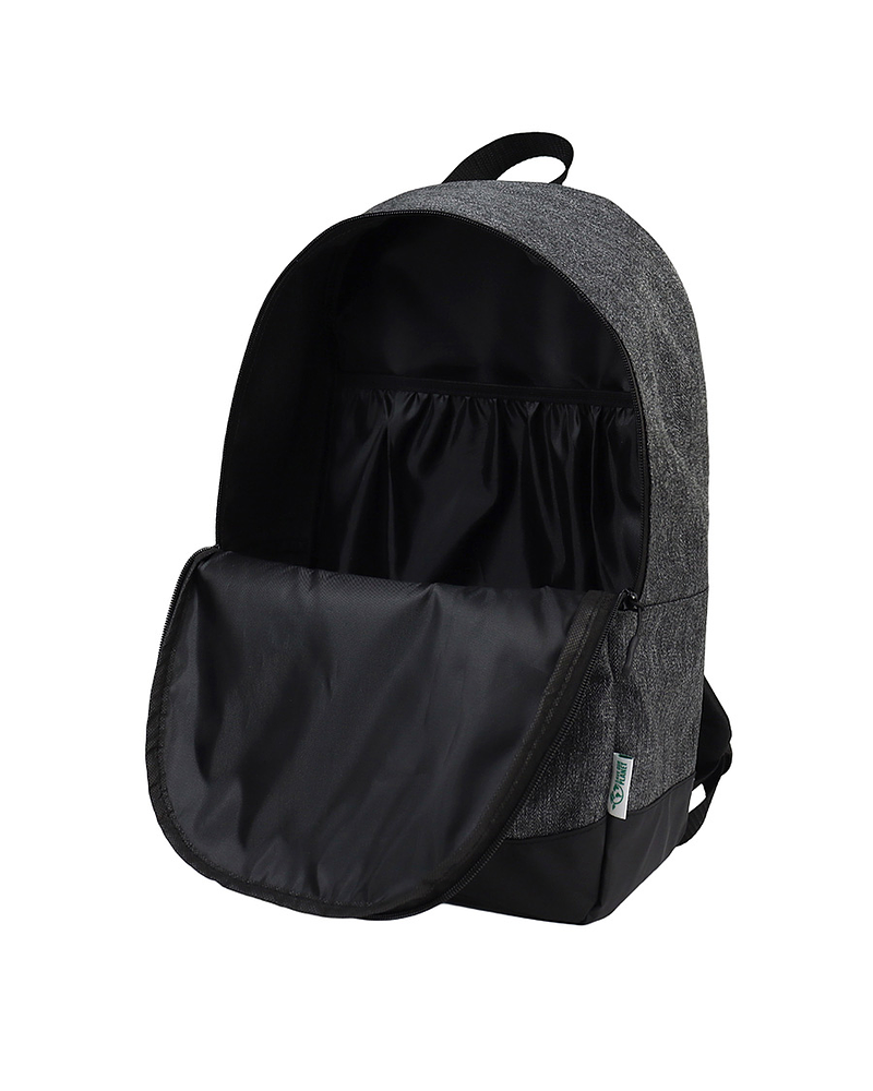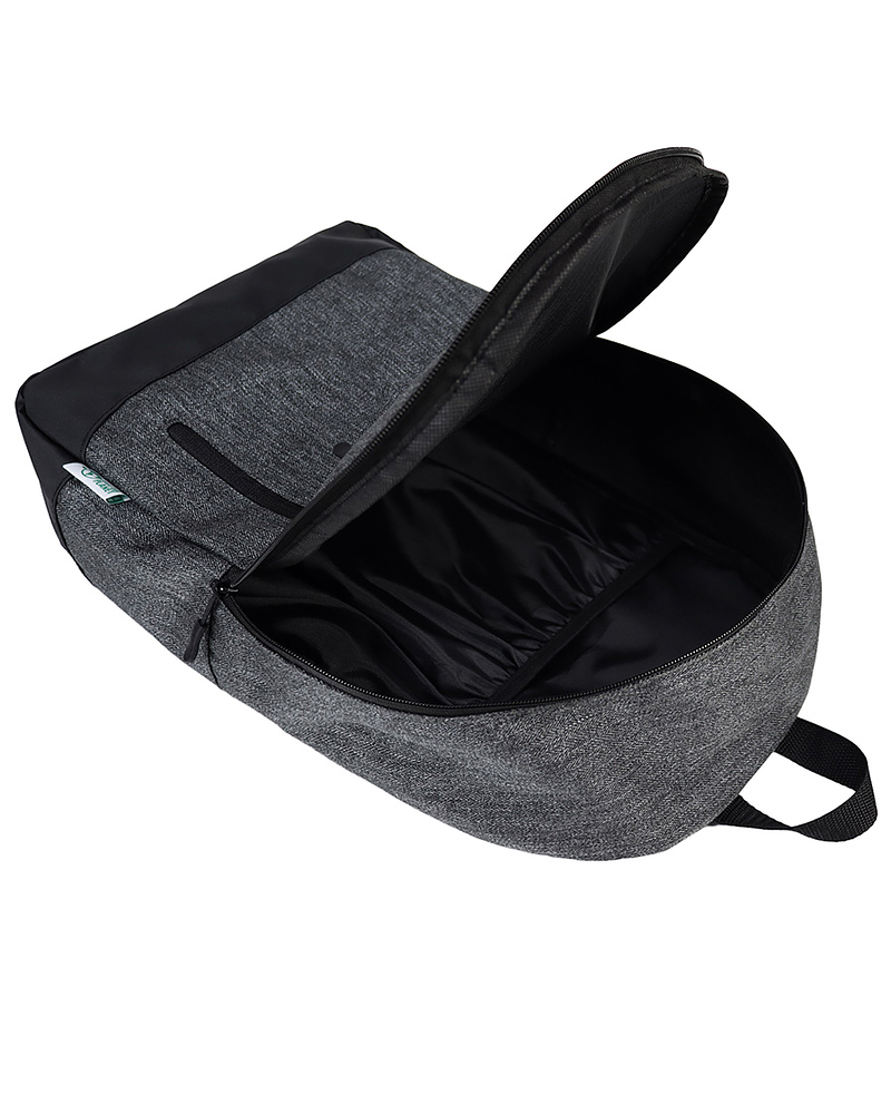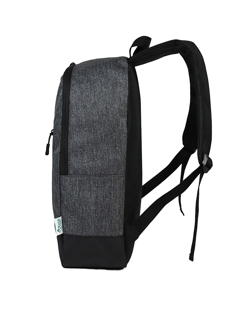 Mochila modelo «LOOK», fabricada en tela reciclada RPET, con base de eco-cuero PU 210D y parte posterior de poliéster 600D/PVC. Capacidad 18 litros, tamaño 29 x 44 x 14 cm. Incluye compartimento principal + bolsillo delantero lateral. Incluye forro interior de nylon negro. Correas ajustables.
