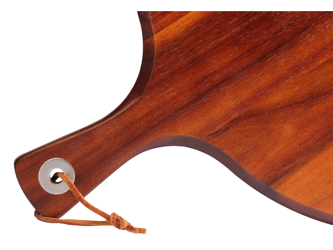 Amplia tabla redonda de madera sólida de acacia , con asa, ideal para cortar y servir Pizza. También para verduras y/o selección de quesos. Madera trabajada y acabada en máquina, de forma 100% regular, con superficies y cantos lisos y suaves, para una mayor higiene y comodidad al momento de cortar y servir alimentos. La Acacia, junto con la Teca, es considerada la mejor, más dura y más resistente madera para utilizar para cortes dealimentos - Densidad aprox. 770kg/m3. - Dureza 9.5 (test de Monnin)