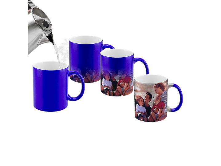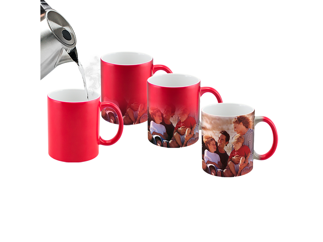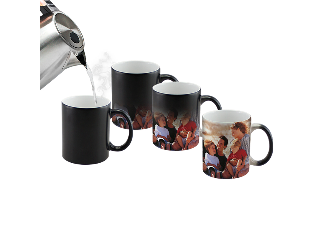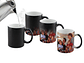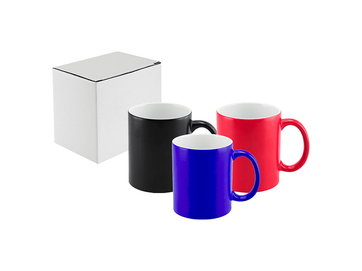 Tazón cerámico mágico color Mate (opaco) para Sublimación. Contiene polímero termo-reactor en la pared exterior del tazón. A primera vista parece un tazón negro estándar, pero en contacto con líquido caliente, la imagen sublimada comienza a aparecer nítidamente en el tazón. Una vez que el líquido se enfría, la imagen se desvanece y vuelve a aparecer el negro mate. Presentación caja blanca de Cartón.