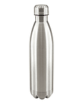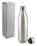 Termo modelo "Botella" de 3/4 litro, en Acero inoxidable, tapa rosca. Presentación en estuche de cartón laminado plateado.