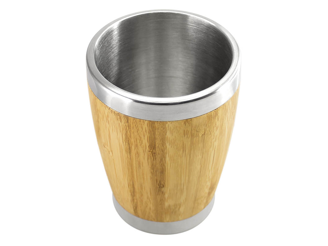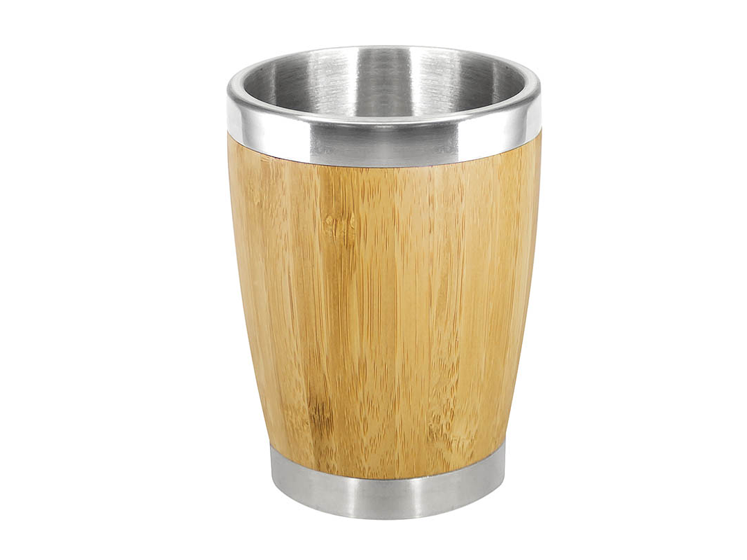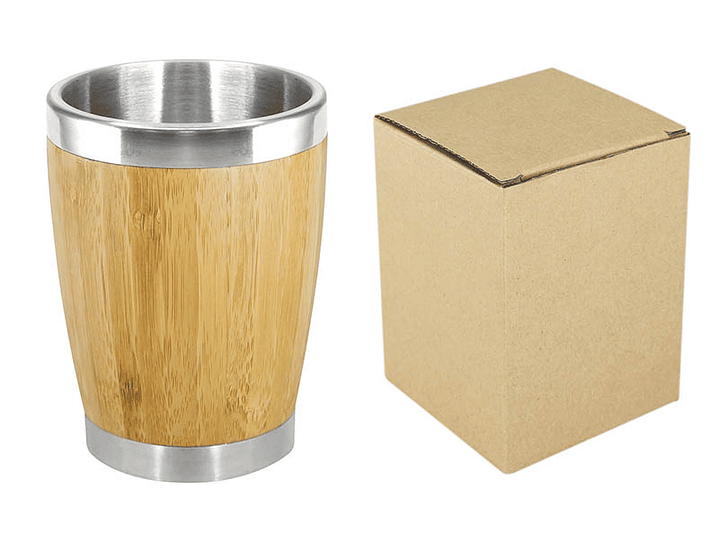 Vaso de madera de Bambú, interior de Acero Inoxidable. Presentación en caja de cartón forrado natural.